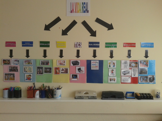 En la clase lila tenemos un cartel en el que vemos todo lo que vamos a hacer durante todo el curso los alumnos/as de esta clase. Así sabemos las habilidades que vamos a trabajar, por ejemplo, atar los zapatos, los botones, sublr la cremallera, hablar respetando los turnos de palabra, cruzar los pasos de cebra, ir al supermercado, ir a la biblioteca, utilizar la tablet, el ordenador, hacer fotocopias, la encuadernación, plastificar, el reloj, el dinero, los equipos de protección individual, limpiar las mesas y sillas del comedor… y !!!muchas cosas más¡¡¡
